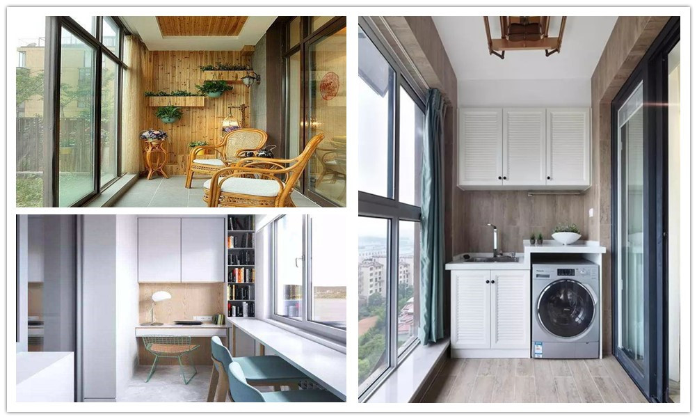 生活阳台可休闲,也可用于工作学习;柜体的收纳能多不少;有下水放置洗衣机也是更好的选择;洗衣晾晒两不误;