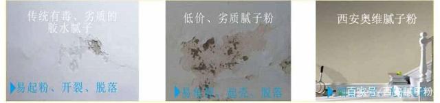 很多业务问:“我花了那么多钱做墙面油漆,买得是名牌涂料,一年多墙面就出现裂缝、发霉脱落起皮等现象。这是为什么呢?”其实这种情况普遍存在,原因就在于:你用了被国家强制淘汰的传统有毒、劣质的胶水腻子或低价、劣质的腻子粉。基面腻子层没有处理好,表面用再好的油漆也会出问题。传统腻子、劣质腻子与西安奥维腻子粉腻子的区别
